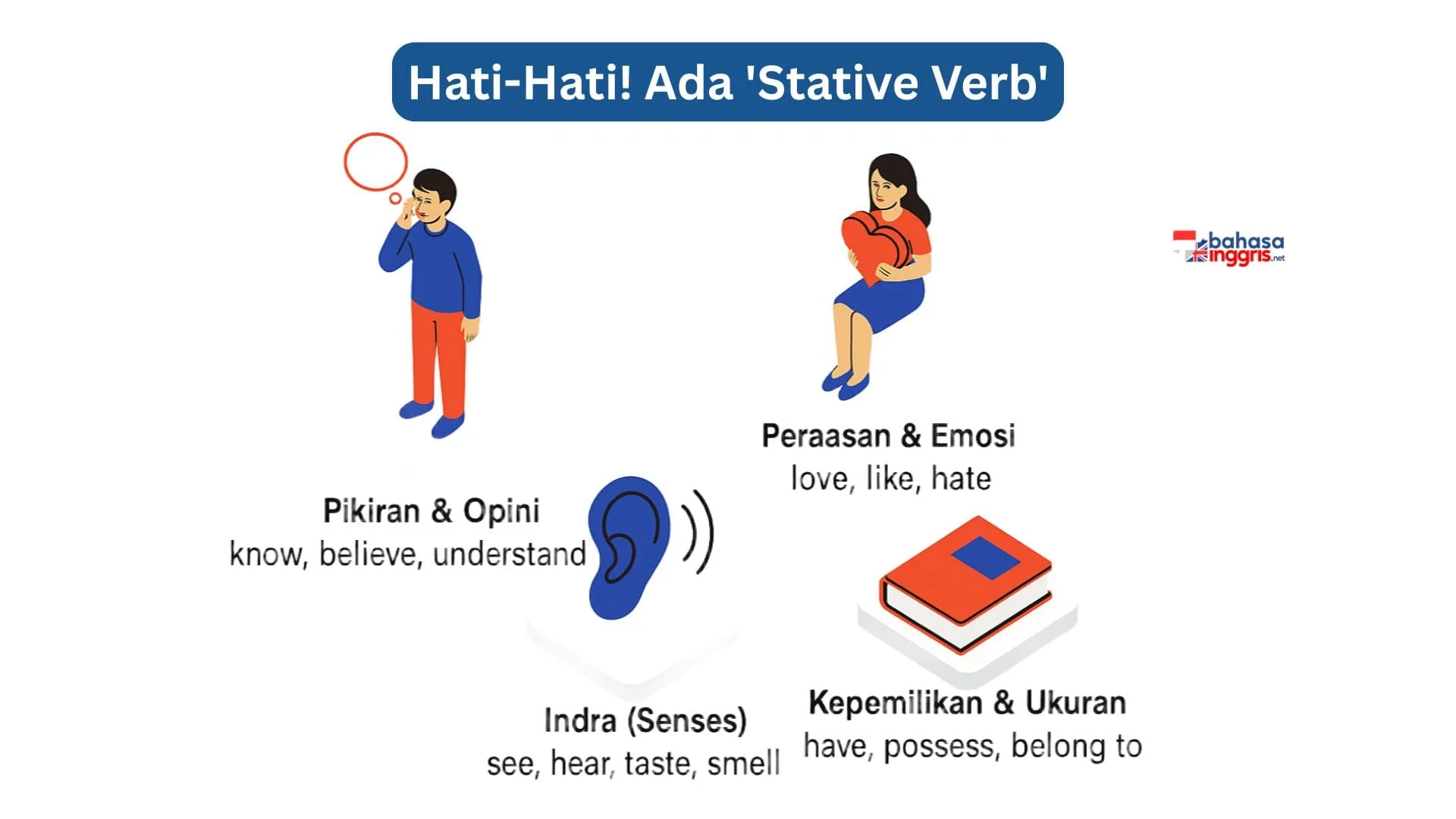 - Pikiran & Opini: know, believe, understand, realize, remember, forget, think (opini), suppose, recognize, agree, disagree.Contoh: I understand the instruction now. (Bukan: